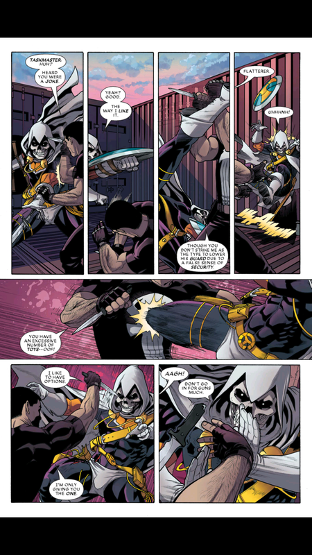 Elektra'nın ikinci dövüşte kendini hazırlaması sayesinde. Daredevil'de radar gücünü kullanarak oyuna getiriyor Taskmaster'ı Moon Knight ise psikolojik baskı ile çökertiyor Taskmaster'ı